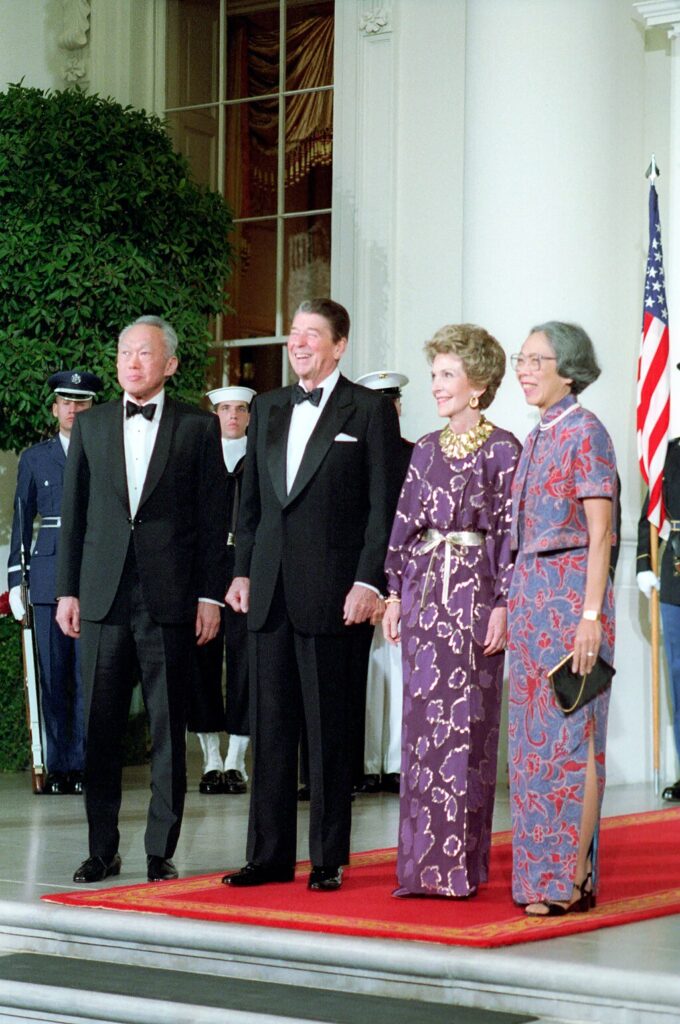 Photo: President Ronald Reagan with Prime Minister Lee Kuan Yew Nancy Reagan and Mrs Lee on The North Portico Before a State Dinner for Prime Minister Lee Kuan Yew of Singapore, 10/8/1985. Series: Reagan White House Photographs, 1/20/1981 – 1/20/1989 Collection: White House Photographic Collection, 1/20/1981 – 1/20/1989, Public domain, via Wikimedia Commons